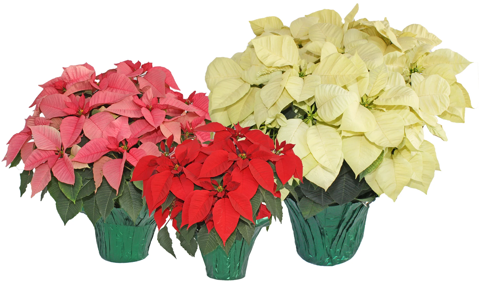 12" Florist Poinsettia • Our tallest display with three pinched plants per pot, 28-32" spread and 27" height from bottom of pot • Includes plant ring for support • Shipped 2 per box • Available in standard colors