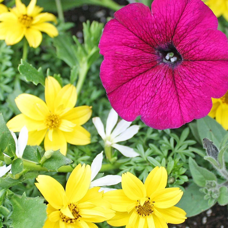 1388 Bidens Namid Special Yellow, Petunia Suncatcher Burgundy, Scaevola Bombay White