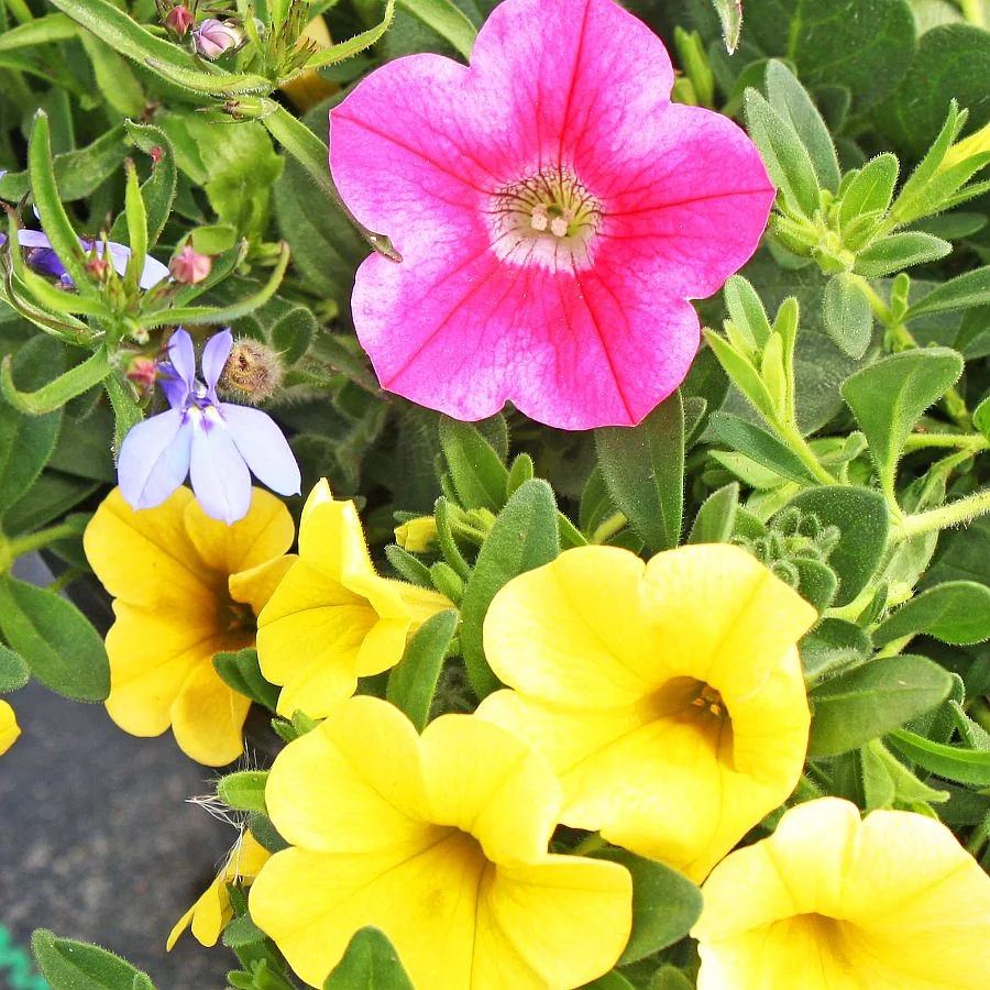 1383 Calibrachoa MiniFamous Dbl Deep Yellow, Lobelia Techno Heat Lt Blue. Petunia Whispers Star Rose
