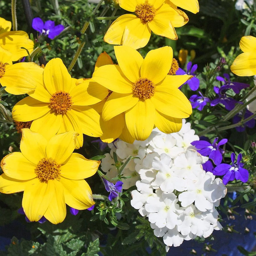 1387 Bidens Namid Special Yellow, Lobelia Magadi Dark Blue, Verbena Pops White