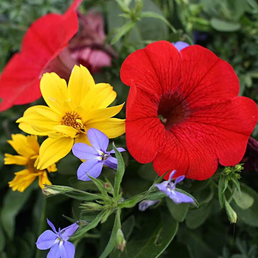 1391 Bidens Mexican Gold, Lobelia Techno Heat Elec Blue, Petunia Cascadia Simply Red