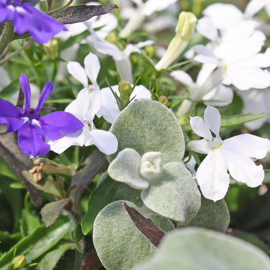 1395 Helichrysum Silver Mist, Lobelia Techno Heat Dark Blue, Violet and White