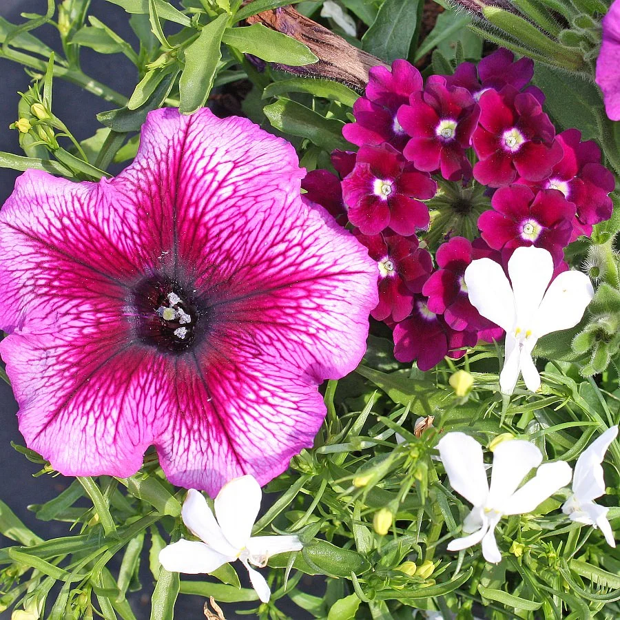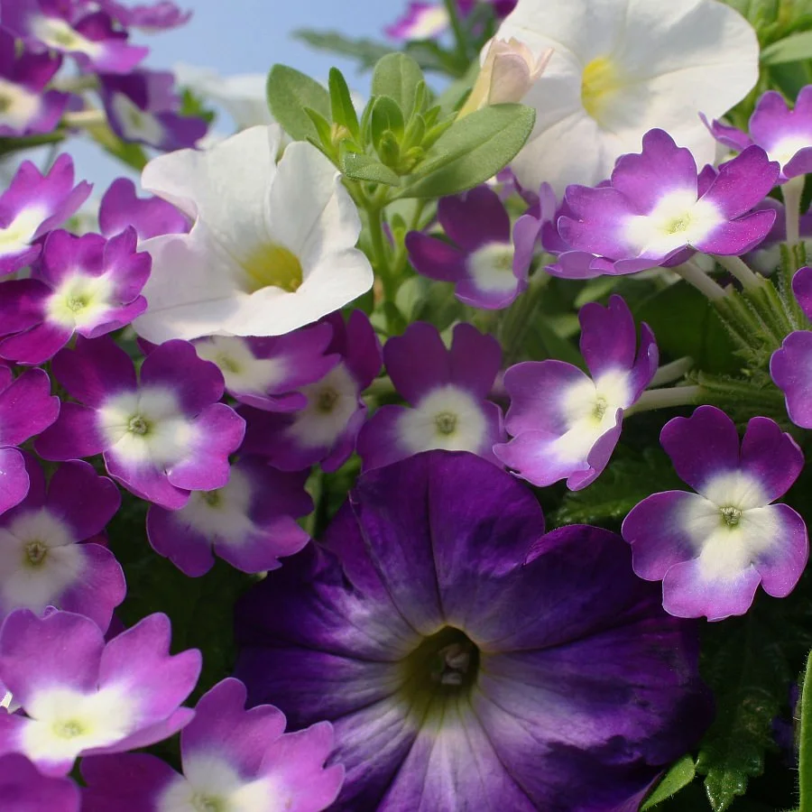 1401 Calibrachoa Cabaret White, Petunia Flash Mob Bluerific, Verbena Aztec Violet Wink