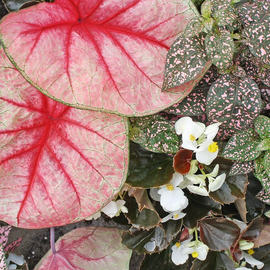 1565 Begonia Harmony White, Caladium White Delight, Hypoestes Splash Select Pink